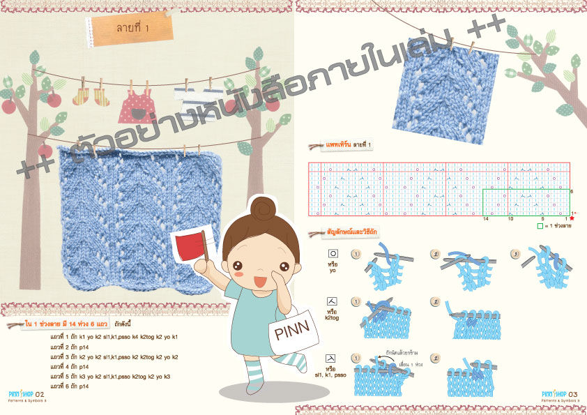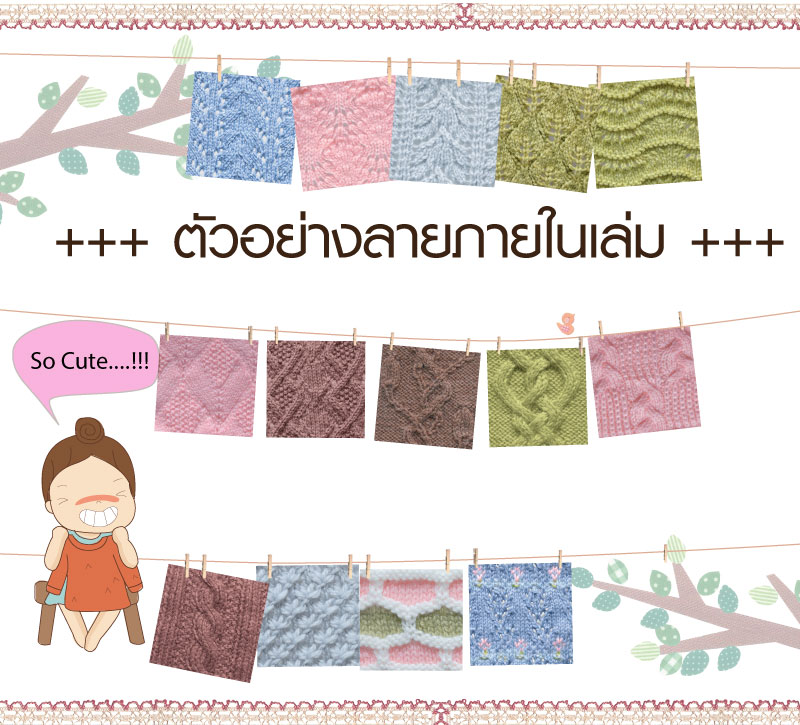 ++ หนังสือแพทเทิร์นถักนิตติ้งเป็นลวดลายต่างๆ มากถึง 15 ลาย มีภาพวาดพร้อมคำอธิบายโดยละเอียดชัดเจน จำนวน 36 หน้า (ไม่รวมปก)พิมพ์ 4 สีทุกหน้า ขนาด A5